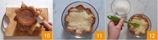 Now take the pandoro and cut 2 slices 0.79 inches thick 10. Place the first slice in a transparent bowl with a diameter of 7.87 inches 11 and brush it with a little milk 12.