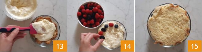 Spread half of the mascarpone cream on the pandoro slice 13, then add half of the wild berries, which you have previously washed and dried 14. Cover with the second slice of pandoro 15 and brush again with a little milk.