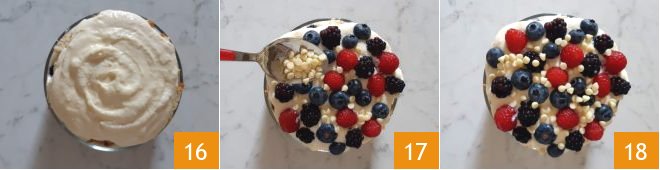 Add the remaining cream 16 and the remaining wild berries, then garnish with the white chocolate chips 17. Your pandoro tiramisù with wild berries is ready to be served 18!
