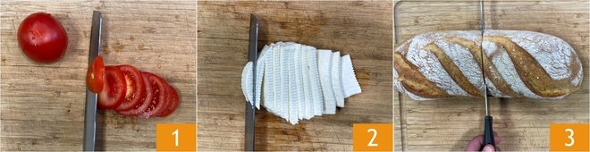 To prepare the pane cunzato, first, heat the fresh loaf of bread in a preheated conventional oven at 390°F for about ten minutes. Wash and cut the tomatoes into slices less than 1/4 inch thick 1, then slice the primo sale cheese as well 2. Take the loaf of bread out of the oven and divide it into 2 parts 3.