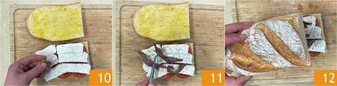 Finally, sprinkle with dried oregano 10 and add the anchovy fillets 11. Close with the other half of the bread 12 and repeat the same procedure to prepare the second sandwich. Your pane cunzato is ready to be enjoyed!