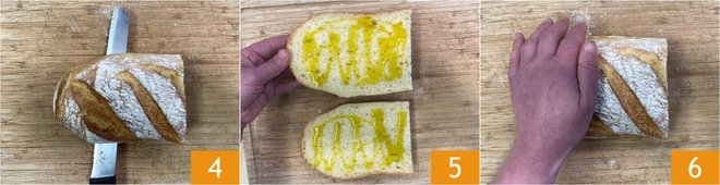 Cut each part in half horizontally 4 and drizzle with plenty of olive oil 5, then press the 2 halves together to distribute the oil evenly 6.
