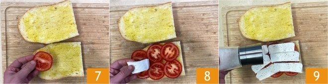 Place the tomato slices on the base of the sandwich 7, then cover with the primo sale slices 8. Season with salt 9 and pepper.