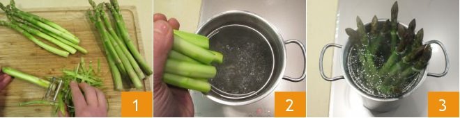 To prepare pappardelle pasta with shrimps and asparagus, start by cleaning the asparagus: cut off the bottom and peel the lighter colored and tougher part 1. Boil the asparagus whole in a special asparagus pot for 5-10 minutes 2, with the tips out of the water 3. Don't cook for too long as overcooked asparagus loses its consistency; the cooking time depends on the size of the asparagus.
