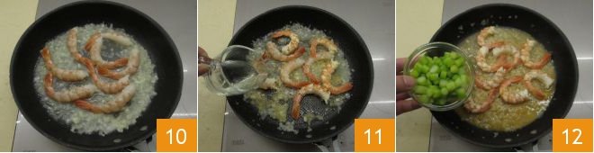 Add the peeled shrimp tails 10, cook for a few minutes and add the white wine 11. Simmer, reduce and then add the sliced asparagus 12.