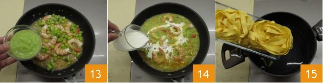 Incorporate the sauce 13 and the cream 14, salt, pepper to taste and cook on a moderate flame. In the meantime, cook the pasta for around 4 minutes, or for as long as it says on the packet 15.