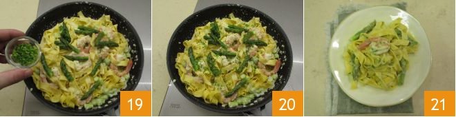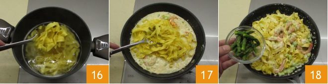Drain the pasta 16 and save the cooking water. Add the pappardelle pasta to the sauce 17, followed by the asparagus tips you left to one side 18; sauté for a few moments and add some cooking water if necessary.