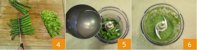 Remove the asparagus from the pot and cut half of the stalks into slices 4; leave the tips to one side. Use the remaining half of the asparagus to create a sauce: blend in a mixer with a ladle of cooking water 5, to make a creamy mixture 6.