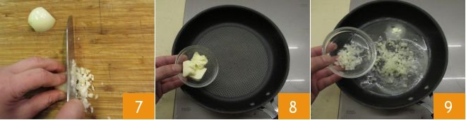 In the meantime, finely chop the onion 7, dissolve 2 tablespoons of butter in a non-stick pan 8, add the finely chopped onion 9 and leave to brown for around 3 minutes on a medium flame. In the meantime, bring a saucepan filled with water to the boil, for cooking the pasta.