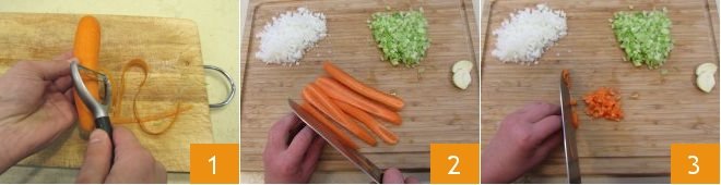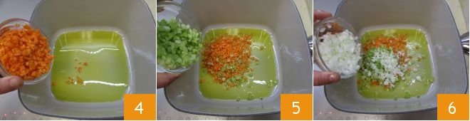 Pour the oil into a thick-bottomed pot and add the chopped carrots 4, celery 5, and onion 6.