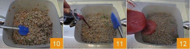Raise the heat slightly and let everything brown for another 10 minutes, stirring with a spatula 10, to cook the meat evenly. At this point, deglaze with red wine 11, and only when the alcohol has completely evaporated, add the tomato puree 12.