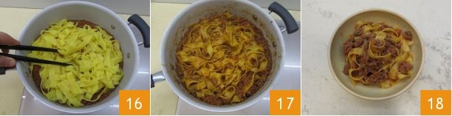 In the meantime, transfer the ragù to a large pot, drain the pasta, and pour it into the pan with the sauce 16, stir until everything is well combined 17, and serve your pappardelle with wild boar ragù still hot 18.