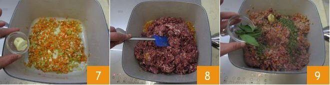 Also add the garlic in large pieces (so you can remove it more easily at the end of cooking) and let everything stew for about ten minutes on low heat 7. Add the minced wild boar 8, chopped rosemary, and bay leaves 9.