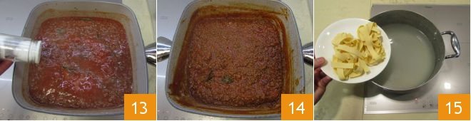 Salt 13, pepper, and let cook covered for about 3 and a half hours on low heat, then remove the lid and let the ragù dry out for another 30 minutes 14. Cook your pappardelle in plenty of boiling, salted water to taste 15.