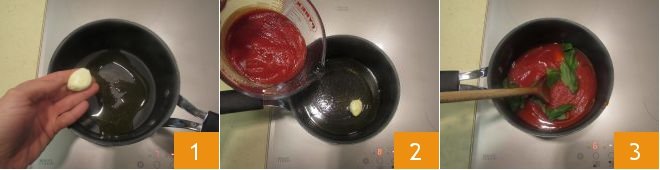 To prepare your parmigiana sandwich, start with the sauce. Heat a little oil together with a peeled clove of garlic in a saucepan 1. After a few moments, add the tomato puree 2, followed by the basil leaves. Stir, cover with a lid, and leave to cook on low heat for around 25 minutes 3.