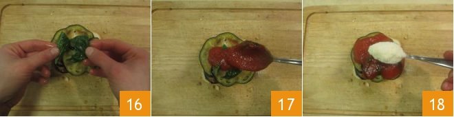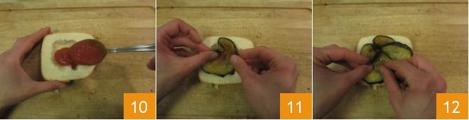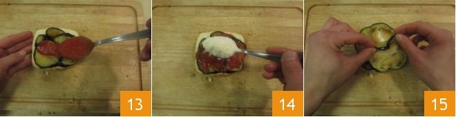Now for the filling. Start by pouring a little sauce into the hollowed-out base 10, then place 3 slices of eggplant inside 11, trying to leave a little space in the middle 12 as you do so.