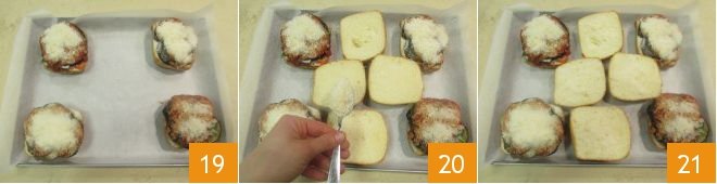 Gradually transfer the stuffed rolls onto a baking tray lined with parchment paper 19, add the tops separately and sprinkle them with Parmigiano cheese 20. Bake in a hot oven at 390°F (200°C) for around 10 minutes, then switch to broil mode at 460°F (240°C) for a couple of minutes 21.