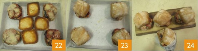 Only brown the bread; do not let it burn 22. Finally, place the tops back onto the filled halves 23 and your parmigiana sandwiches are ready to serve 24.