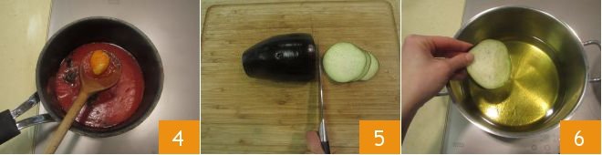 Allow the sauce to thicken, stirring occasionally to make sure it doesn’t burn. Once cooked, remove the garlic and add salt to taste 4. Meanwhile, prepare the eggplants. First, wash and dry them, then slice them to a thickness of ?” (2-3 mm) to obtain exactly 20 round slices 5. Heat a good glug of vegetable oil in a saucepan, and once it reaches 340°F (170°C) (we recommend using a thermometer to check), immerse a few pieces into the oil at a time 6.