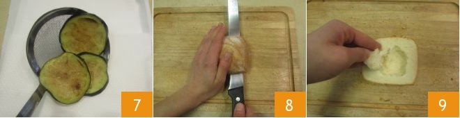 Once golden brown, which should take 1-2 minutes, drain the slices on paper towel 7. Next, move on to the bread. Cut the rolls in half using a serrated knife 8, then set the tops aside and remove a good part of the crumb 9 from the inside of the base.