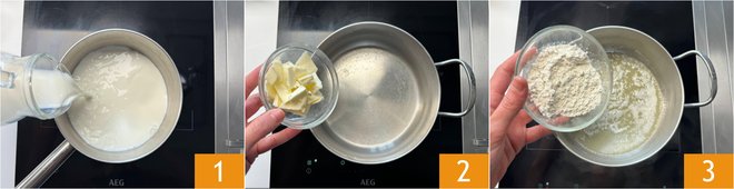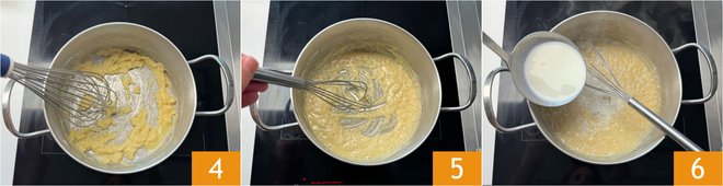 To prepare the Parmesan cream, first heat the milk in a saucepan 1, it should not reach a boil. In another pot, put the butter 2 and melt it over low heat. Add the flour gradually 3.