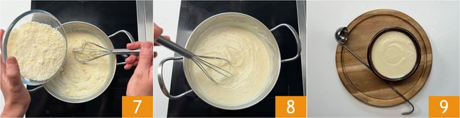 Turn off the heat and add the grated Parmesan 7, little by little, stirring continuously with the whisk. You should achieve a fairly dense consistency 8; if you take a spoonful of cream and let it fall back into the pot, it should remain on the surface for a few moments before merging, indicating the correct consistency. Your Parmesan cream is ready to be used in your preparations 9.