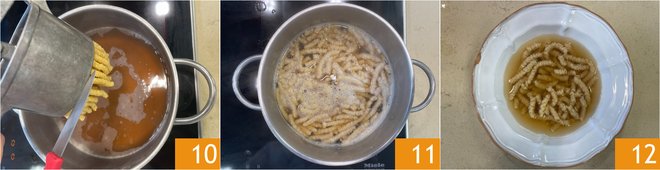 Continue kneading with your hands 7 and work it for a long time until you get a firm and elastic dough. Cover the bowl with plastic wrap and let it rest in the refrigerator for about 15-30 minutes 8. After this time, bring the broth to a gentle boil and insert a portion of dough at a time into a potato ricer with holes at least ¼ inch wide 9.