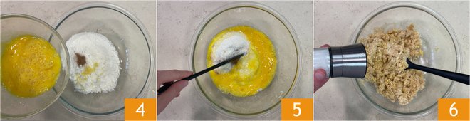 Beat the eggs separately and add them to the mixture 4. Mix the ingredients with a fork 5, then adjust the salt 6.