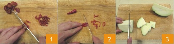 To prepare the pasta salad with eggplants and sun-dried tomatoes, start by cutting the sun-dried tomatoes into thin strips 1. Then remove the seeds from the fresh chili pepper and cut it into very thin strips as well 2. Then cut the eggplant into 4 wedges, and slice each wedge into 1/8 inch (3-4 mm) slices 3.