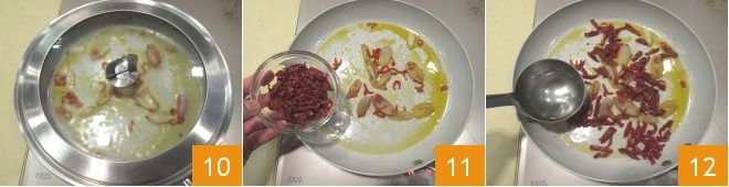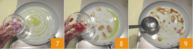 While the pasta is cooking, sauté the chopped shallot in large pieces in a pan where you have heated the oil over high heat 7, then add the chili pepper 8 and a ladle of pasta cooking water 9.