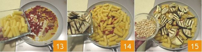 Drain the pasta al dente, and add it to the sauce in the pan 13. Also add the eggplants 14 and the toasted pine nuts 15.