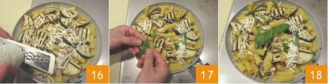 Sauté the pasta for a couple of minutes, then sprinkle it with grated salted ricotta 16, coarsely hand-torn basil 17, and serve your pasta salad with eggplants and sun-dried tomatoes hot or cold according to your taste 18!