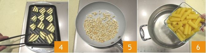 Grill the eggplant slices on a hot griddle for about 2 minutes per side 4. Toast the pine nuts in a non-stick pan for 3-4 minutes, being careful not to burn them 5. At this point, throw the rigatoni into boiling salted water 6.
