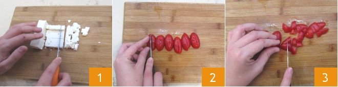 To prepare the pasta salad with peaches, start by cutting all the ingredients. First, cut the feta into cubes of about a quarter inch 1, then cut the cherry tomatoes into wedges lengthwise 2 and then chop them into small pieces 3.