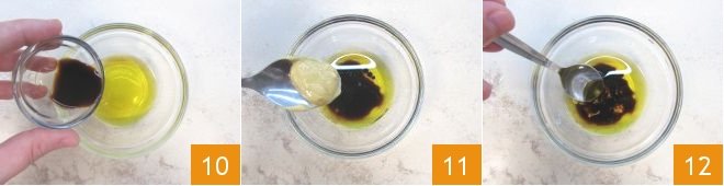 Then prepare the vinaigrette: in a small bowl, combine the oil and balsamic vinegar 10, add a dash of mustard 11, and mix well by whisking with a teaspoon 12 (if you prefer, you can also emulsify with a hand blender or shake the ingredients in a mason jar with a sealed lid).