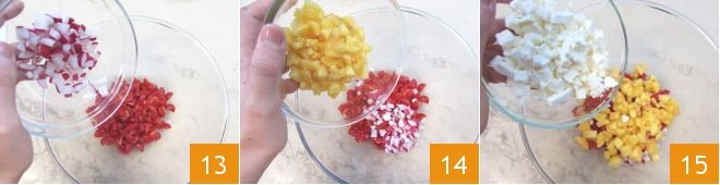 In a large bowl, combine the cherry tomatoes, radishes 13, peaches 14, and feta 15.