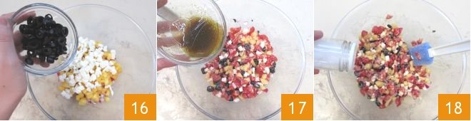 And the sliced olives 16, mix well and season everything with the vinaigrette 17. Finally, adjust the salt 18 and set aside.