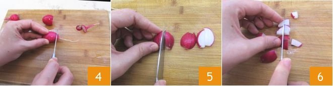 Move on to the radishes: remove the ends and any leaves 4 and then cut them in half, slicing into sticks 5 and finally chopping the sticks into small cubes 6.