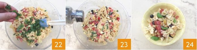 Mix and add the fresh basil, roughly chopped by hand 22. Sprinkle with pepper to taste 23, and finally, plate the dish 24.