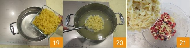 In the meantime, bring a pot of plenty of salted water to a boil, and add the farfalle 19. Cook them al dente so they don't overcook as they cool, drain them thoroughly 20 and let them cool after tossing with a bit of oil to prevent sticking. Once cooled, add them to the bowl with the dressing 21.