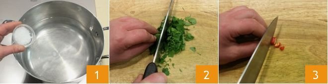 To prepare Pasta alla Carrettiera, pour water into a large pot, salt to taste, and bring to a boil 1. Then chop a bunch of parsley 2 and the fresh chili pepper 3.