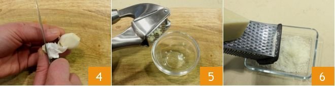 Peel the garlic clove 4, remove the inner green sprout, and chop it 5; then grate the Pecorino cheese 6.