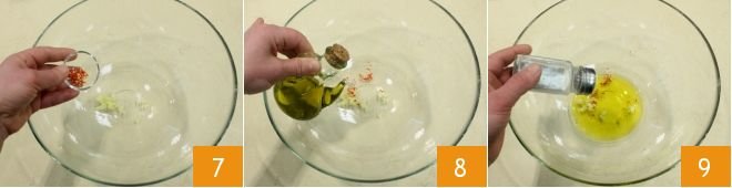 In a large bowl, add the chopped garlic and chili pepper 7, plenty of olive oil 8, and salt to taste.