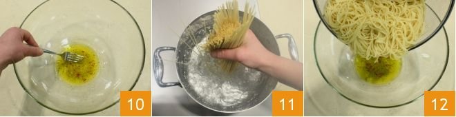 Mix the emulsion with a fork 10. Meanwhile, when the water boils, cook the spaghetti 11, then drain them al dente, reserving the cooking water, and toss them in the bowl with the oil, garlic, and chili pepper mixture 12.