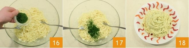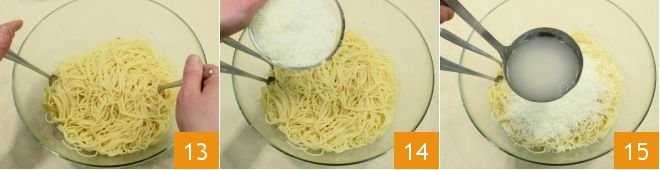 Quickly mix the spaghetti 13 and add the grated Pecorino cheese 14 and a ladleful of cooking water 15.