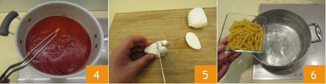 At this point, cover with a lid, and leave to cook for 30 minutes over low heat before removing the garlic clove 4. Heat a pot full of water to cook the pasta, and in the meantime, cut the mozzarella into cubes 5. Once the water has reached a boil, cook the pasta al dente 6