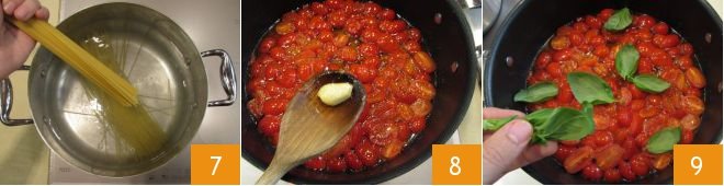 Meanwhile, boil the spaghetti 7 until it is cooked al dente. Once the tomato sauce is ready, season with salt, remove the garlic 8, and add some of the basil leaves 9. Add a ladleful of cooking water to create a delicious creamy texture.