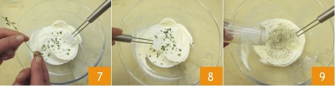 Add the thyme leaves 7, mix again 8, and finally adjust with salt and pepper 9.