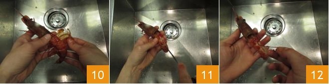 Take the red king prawns, leave the head on and remove the shell 10, then make a delicate incision on the back 11 and devein 12 to remove the sandiest part.
