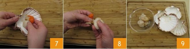 Now for the scallops. Remove them from the shell 7, but don't throw it away because we will use it for decorating. Eliminate the coral 8 and leave to one side 9.